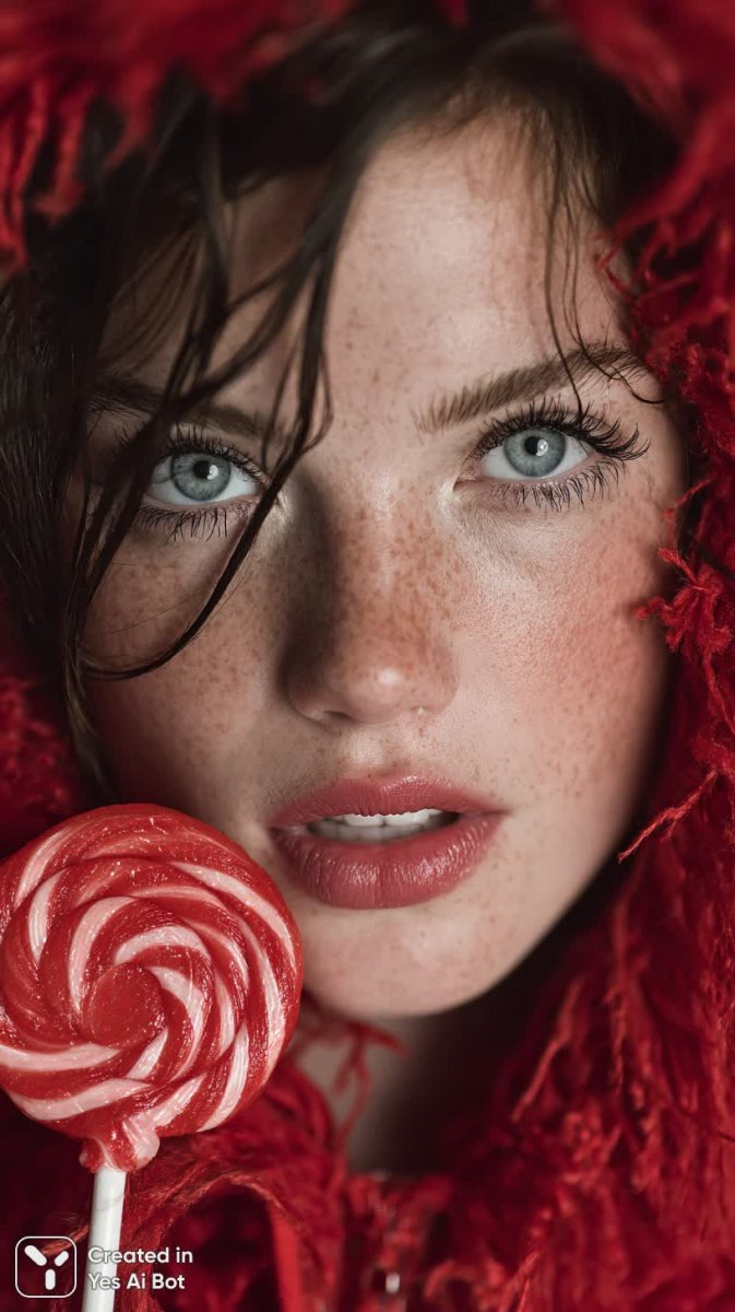 young woman with fair skin and dark eyeliner, styled in a red fluffy sweater, posing with a lollipop, neutral gray BG, dramatic lighting, portrait shot, focus on face, studio lighting, high quality --s 750