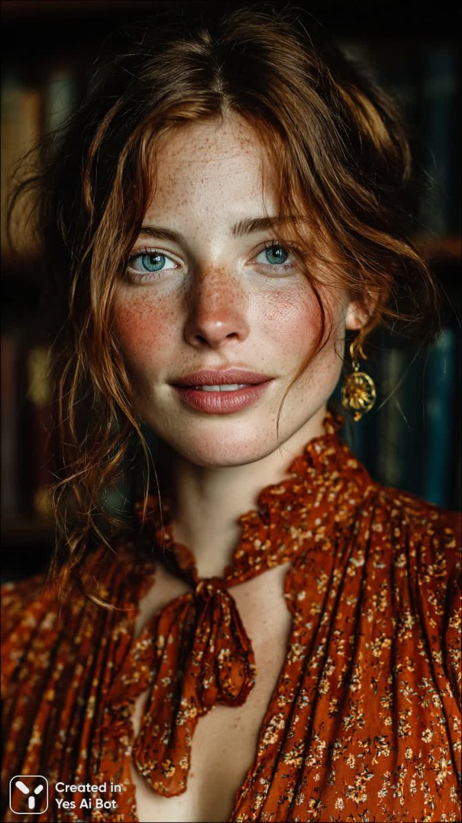 woman with long flowing auburn hair, antique gold earrings, vintage floral dress, subtle rosy blush on cheeks, gentle smile, library filled with books, warm natural lighting, close-up portrait, 85mm lens, canon eos 6d mark ii camera, editorial photography --s 750