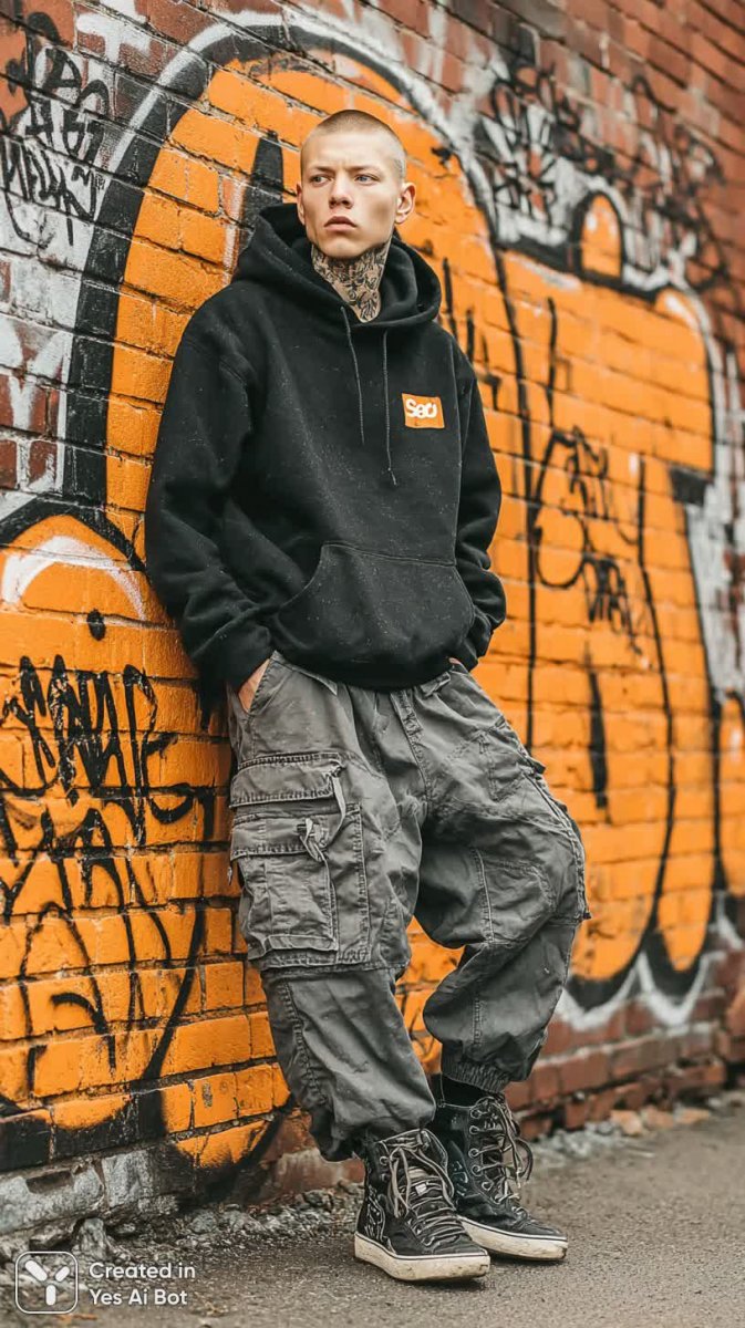 Мощный портрет молодого человека, воплощающий дух современного урбанизма и бунтарский характер. Лицо с бритой головой подчеркивает смелость и решительность, а дерзкие геометрические татуировки добавляют образу уникальности и индивидуальности. Черный худи и практичные карго-брюки создают контраст между повседневной одеждой и выразительным художественным оформлением. Взгляд, полный внутренней силы и напряжения, приковывает внимание зрителя, передавая сложную гамму эмоций. Фон из яркого граффити искусства усиливает ощущение динамичности и неординарности происходящего. Суровое направленное освещение подчеркивает текстуру кожи, детали татуировок и создает драматическую атмосферу. Снятый в полный рост широкоугольным объективом на камеру Nikon D850, этот снимок передает масштабность образа и погружает зрителя в мир городской культуры. Эта работа – яркий пример современной уличной фотографии, сочетающей в себе визуальную силу и глубокий символизм, отражая дух свободы, самовыражения и непокорности. Фотография демонстрирует мастерство фотографа в создании запоминающихся портретов, которые не просто фиксируют момент времени, но и рассказывают историю человека, живущего в ритме большого города, полного вызовов и возможностей. Здесь переплетаются элементы моды, искусства и уличной культуры, создавая неповторимый визуальный опыт