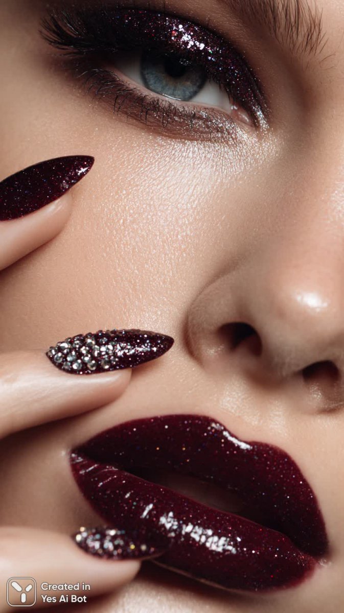 female face close-up, dramatic eye makeup with deep burgundy lips, glittery dark eyeshadow on eyelids, bold long false eyelashes, sculpted nose with silver nose piercing, thick eyebrows, long nails with sparkles and large rhinestones, matte skin, glamor style, bg blurred.