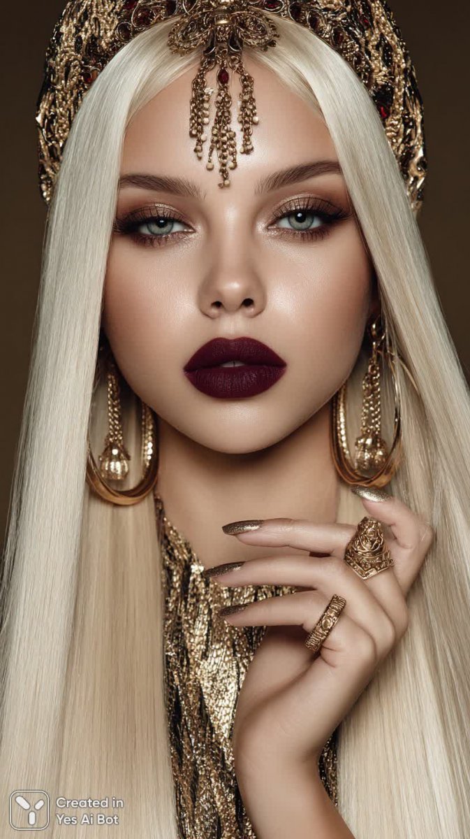 luxurious woman with long straight light blonde hair, dramatic eyeshadow with bold eyeliner, voluminous lips with deep wine lipstick, metallic nails, chunky gold rings on fingers, large hoop earrings with pendants, golden headdress, rich tan skin, opulent style, glamor style, bg black.