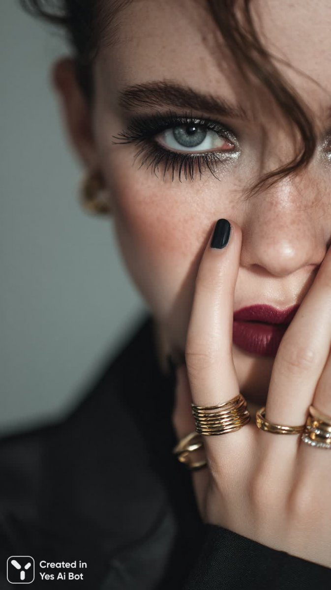 woman with dramatic eye makeup, bold lashes, matte lips, multiple rings on fingers, black leather jacket, glamor style, soft blurred bg, close-up shot, high detail, fashion photography.