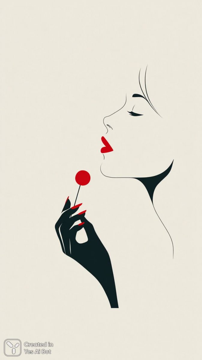 Изящный графический портрет современной женщины в минималистичном стиле. Акцент на губах насыщенного алого оттенка, деликатно изогнутых в легкой улыбке, создает ощущение уверенности и сдержанной привлекательности. В руках героини – яркий леденец в полоску, цвет которого элегантно перекликается с ухоженными ногтями, добавляя образу нотку игривости и беззаботности. Фон выполнен в светлых тонах, что позволяет выделить четкие линии и контрастные элементы иллюстрации. Работа выполнена в технике векторной графики, обеспечивая безупречную детализацию и возможность масштабирования без потери качества. Чистые контуры и лаконичный дизайн подчеркивают современный подход к искусству, делая изображение визуально привлекательным и запоминающимся. Эта иллюстрация идеально подойдет для оформления модных блогов, рекламных материалов или просто в качестве стильного акцента в дизайне интерьера. Она воплощает собой эстетику минимализма, сочетая в себе простоту форм и яркие цветовые решения, создавая гармоничный и утонченный образ современной женщины. Идеальное сочетание графики и стиля для тех, кто ценит элегантность и современный дизайн