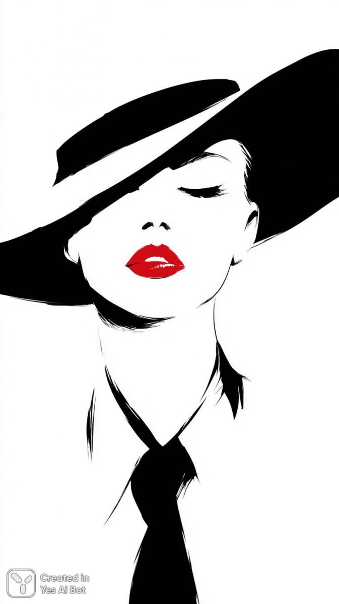 Изящное женское лицо, выполненное в минималистичном стиле, напоминающем мультяшную графику, приковывает взгляд своей простотой и выразительностью. Губы выделяются ярким, насыщенным красным цветом, создавая эффектный акцент на фоне монохромного изображения. В черно-белом исполнении особенно заметны четкие линии, подчеркивающие контуры лица и придающие портрету лаконичность. Дополнительные детали – элегантный полосатый галстук и широкополая шляпа – добавляют образу нотку ретро-шика и загадочности. Вся композиция излучает утонченность и стиль, сочетая в себе элементы классической портретной живописи и современного графического дизайна. Несмотря на кажущуюся простоту, изображение передает тонкую игру света и тени, подчеркивая глубину взгляда и загадочность выражения лица. Это не просто портрет – это стилизованное представление женской красоты, воплощенное в минималистичной форме. В нем чувствуется влияние поп-арта и графических техник, создающих запоминающийся визуальный образ. Акцент на губах и аксессуарах добавляет динамики и привлекательности композиции