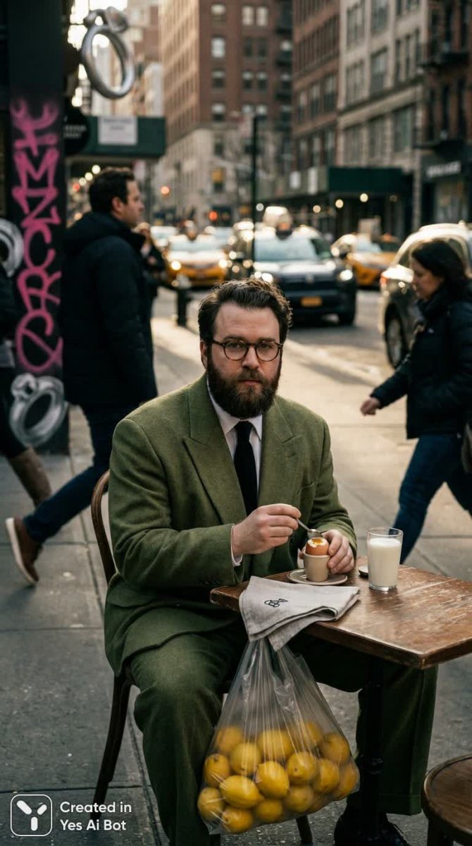 a confident man with round glasses and a short beard, wearing an oversized green suit and a black tie, sits at a small round wooden table in a busy city sidewalk setting, his expression serious as he gently scoops the top of a soft-boiled egg with a spoon, surrounded by people walking past him, some blurred in motion; on the table, a glass of milk alongside a folded napkin with a small black accent displaying prominently, creating a cinematic mood enhanced by dramatic lighting highlighting his outfit and accessories; he gazes directly into the camera with a calm, intense gaze while holding a large clear plastic bag full of bright yellow lemons on his lap, positioned in the center of the frame against an urban background featuring tall buildings and cars captured through a shallow depth of field, reminiscent of a high-end camera lens like a leica sl2-s with a 90mm lens bokeh creating a smooth, subtle color grading effect; crisp details showcase realistic textures, emphasizing the seriousness and calmness of the moment while also conveying an edgy perspective framed by a white zipper, reflecting modern streetwear sensibilities in an urban fashion editorial style; the background is a contrasting blend of dark and light walls with high contrast, highlighting the vibrant lemons and his sharply tailored suit, resulting in a moody daylight atmosphere that emphasizes the image's elegance, capturing a dynamic composition with smooth bokeh around the edges and focusing on a cool, slightly pursed lips expression as he maintains strong posture; the shot is taken from below, showcasing an overall focus on detail, realism, and subtle shadows to further enhance the cinematic feel while incorporating bold lettering in bright pink alongside oversized silver rings and black sunglasses – all contributing to a unique industrial aesthetic where calmness intensity intertwine within a meticulously crafted scene.