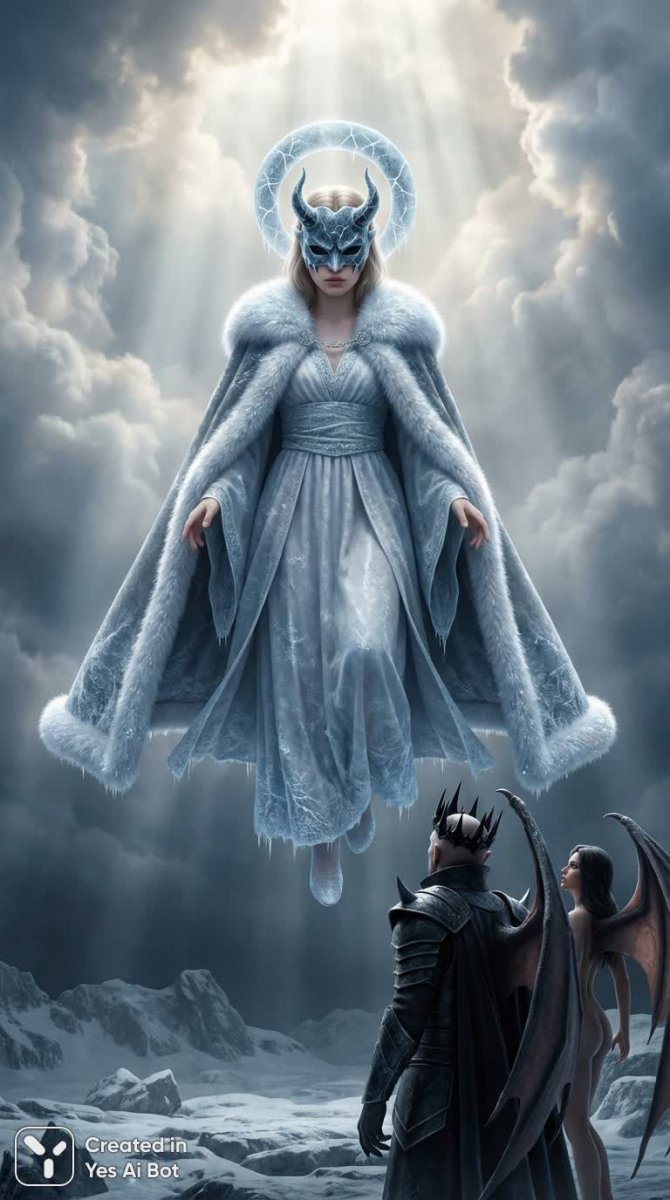 Завораживающий портрет небесного существа, сочетающего в себе невинность и демоническую мощь. В центре внимания – прекрасная женщина-ангел с мудрым, зрелым лицом, окруженная атмосферой ледяной хрупкости, символизируемой трещинами льда под ее ногами. На лице ангела красуется маска дьявола, намекающая на сложную двойственную природу персонажа и его связь с потусторонними силами. На заднем плане возвышается могущественный мужской демон, воплощение царственной силы и власти – сам Асмодей, король ада. Рядом с ним появляется прекрасная драконица, ее образ добавляет мифологической глубины и загадочности происходящему. Композиция выполнена в технике двойной экспозиции, создающей ощущение потустороннего, многослойного мира. Изображение излучает красоту и великолепие, подчеркнутые мерцающим меховым отделкой и высоким разрешением 8k, обеспечивающим невероятную детализацию. Стиль изображения – художественный и кинематографичный, с использованием технологий CGI для достижения потрясающего эффекта HDR. Общий образ напоминает о снежной королеве, но с демоническим отблеском, нисходящей с небес в облаках, что символизирует падение ангела или переход между мирами. Картина представляет собой сложное сочетание света и тьмы, добра и зла, нежности и жестокости, создавая визуально ошеломляющий и запоминающийся образ