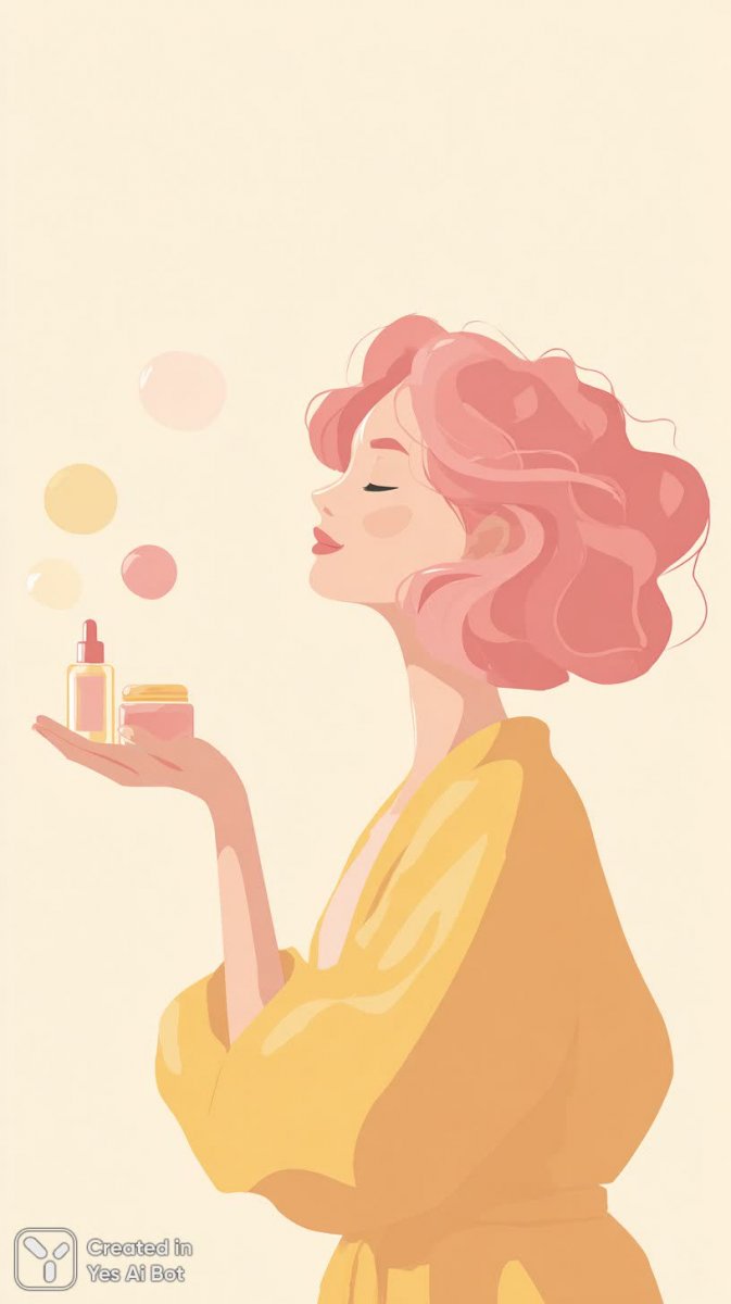 Современная векторная иллюстрация демонстрирует молодую девушку с волнистыми розовыми волосами, умудренно балансирующую в воздухе ряд косметических средств. В ее руках словно парят стеклянный флакон-капельница, дозатор крема и круглая баночка – символы красоты и ухода за собой. Девушка одета в яркий желтый топ, который гармонично сочетается с нежной цветовой палитрой всего изображения. Фон выполнен в светло-розовых тонах, создавая ощущение легкости, воздушности и мечтательности. Иллюстрация выполнена в современном стиле, характеризующимся четкими линиями, минимализмом и акцентом на эстетику. Она идеально подойдет для визуального оформления бьюти-блогов, интернет-магазинов косметики, рекламных материалов или просто станет ярким украшением вашего цифрового пространства. Нежный розовый фон подчеркивает мягкость и деликатность предлагаемых продуктов, а образ девушки вызывает ассоциации с молодостью, свежестью и красотой. Вся композиция создает ощущение гармонии и утонченности, привлекая внимание к деталям и вызывая желание попробовать представленные косметические средства. Это не просто иллюстрация – это визуальная история о заботе о себе и стремлении к совершенству. Яркие цвета и современный дизайн делают ее запоминающейся и привлекательной для широкой аудитории