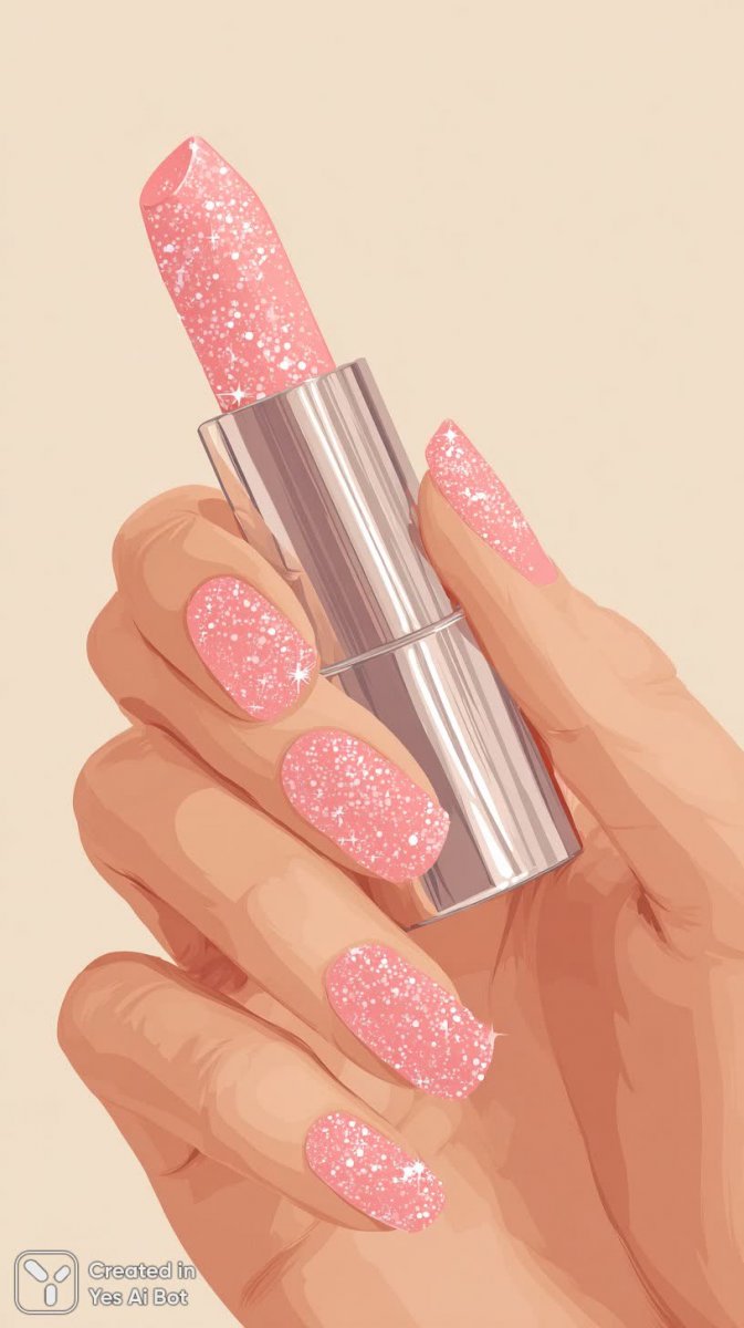 close-up female lips, hand holding pink lipstick, soft pink color, with shimmering sparkles, light beige background, minimal vector style, focus on lip care, detailed fingers.