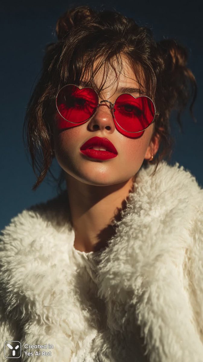 Очаровательная молодая женщина в белоснежной меховой шубе излучает беззаботность и игривость. Яркие красные солнцезащитные очки добавляют образу дерзкий акцент, а лучезарная улыбка подчеркивает ее естественную красоту. Фон, усыпанный алыми сердцами, создает романтическую атмосферу, символизируя любовь и страсть. Съемка выполнена в стиле красоты, с акцентом на деталях и выразительности лица модели. Игра света и тени, создающая насыщенные блики и глубокие тени, придает изображению объемность и драматизм. Композиция построена под углом к зрителю, что позволяет полностью погрузиться в момент. Камера Canon EOS R5 с объективом 35 мм обеспечивает отличную резкость и естественную цветопередачу. Технические характеристики съемки, обозначенные как --s 750, свидетельствуют о высоком качестве изображения и профессиональном подходе к созданию фотографии. Этот кадр – воплощение современной женственности, уверенности в себе и безграничного позитива, запечатленное с любовью и мастерством. Образ излучает легкость и вдохновляет на новые свершения, а яркие цвета делают фотографию запоминающейся и привлекающей внимание