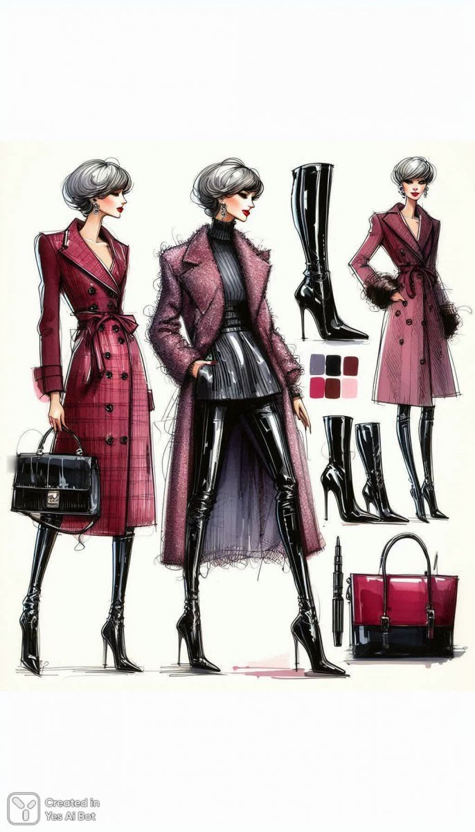 Эскизный набросок, капсульная коллекция. Женщина с короткой стильной стрижкой, седые волосы, длинное вишневое пальто, черные лаковые сапоги на шпильке, большая черно-бордовая стильная сумка, несколько вариантов, скетч, фломастеры