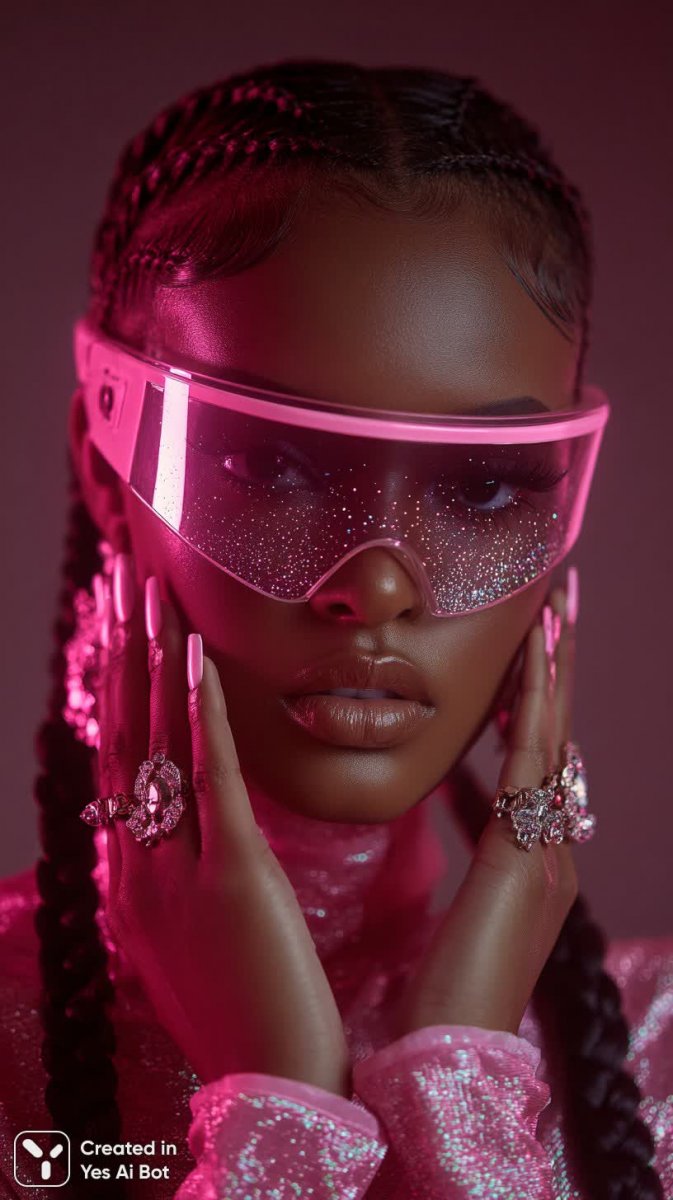 dark-skinned girl with long pink braided hair and glittery makeup, large decorative earrings, pink nails with decorations, wearing a futuristic visor, glamour portrait close-up, neon pink lighting, high gloss, abstract dark BG.