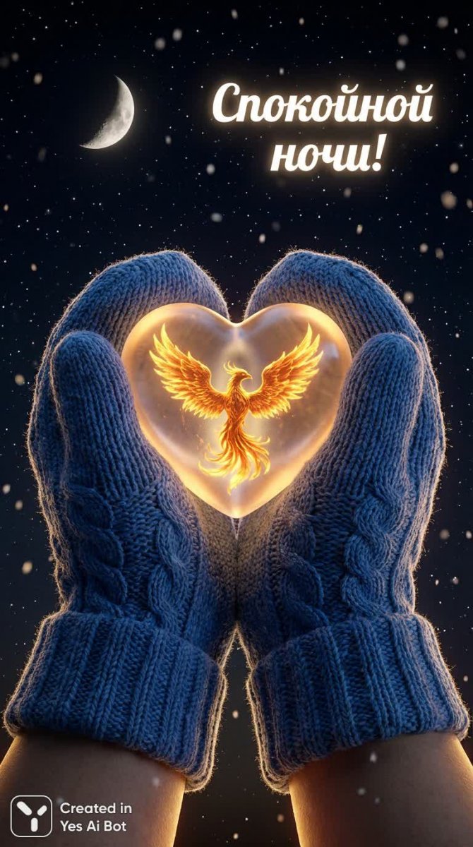 Нежная зимняя сказка, сотканная из тепла и волшебства. В центре композиции – ласковые синие варежки, словно согревающие от холода, бережно удерживают хрупкое прозрачное сердечко. Внутри этого символа любви и надежды расправил свои золотые крылья величественный феникс, воплощение возрождения и вечной красоты. Вокруг царит атмосфера спокойной ночи, усыпанная мерцающими снежинками и освещенная мягким светом полумесяца. На фоне звездного неба элегантно выведена надпись: 'Спокойной ночи!', словно нежное пожелание сладких снов и безмятежного отдыха. Вся картина дышит уютом и гармонией, создавая ощущение тепла домашнего очага и сказочного волшебства. Это идеальный образ для поздравления с ночью, наполненный заботой и любовью, способный подарить чувство спокойствия и умиротворения. Символика феникса добавляет глубину и смысл, напоминая о том, что даже после самых темных времен всегда наступает рассвет. Это визуальное воплощение надежды и веры в лучшее, заключенное в рамках зимней ночи