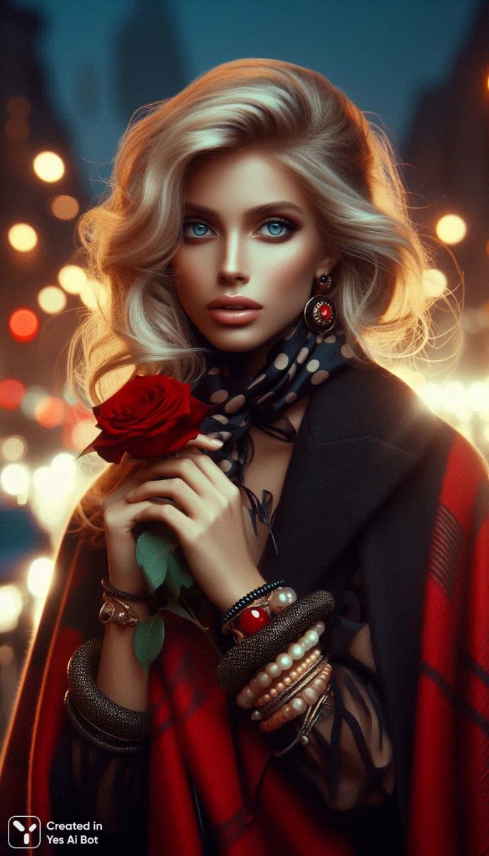 Завораживающий портрет, сотканный из контрастов и утонченной красоты. В центре внимания – элегантная блондинка с дерзкой короткой стрижкой, воплощение современной женственности. Ее образ подчеркнут роскошью черно-красного пальто, которое словно окутывает тайной, и массивными браслетами, добавляющими нотку бунтарства и индивидуальности. Акцент на детали – милый шарфик в горошек, создающий ощущение игривости и легкости, и нежная красная роза, символ страсти и любви. Фон изображения – панорама светящегося ночного города, расплывчатые огни которого добавляют глубины и загадочности композиции. Игра света и тени подчеркивает эмоциональность лица модели, в котором читается легкая грусть и скрытая сила. Это не просто фотография, а история, рассказанная взглядом, жестом, деталью. Высокое разрешение и точная детализация позволяют рассмотреть каждую черту лица, каждую ниточку ткани, каждый блик на металле браслетов. Профессиональное фото передает атмосферу таинственности и притягательности, заставляя зрителя задуматься о судьбе этой загадочной женщины. Это визуальный шедевр, который сочетает в себе классическую элегантность и современный стиль, оставляя неизгладимое впечатление. Фотография излучает уверенность, независимость и неповторимый шарм, делая ее настоящим произведением искусства. Идеально подойдет для рекламных кампаний, обложек журналов или просто для украшения интерьера, добавляя нотку изысканности и стиля