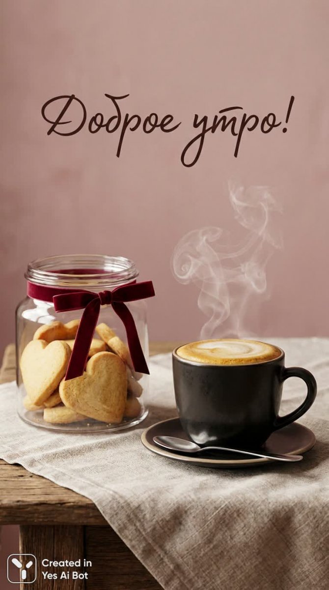 Идеальное начало дня запечатлено в этом восхитительном натюрморте. Нежная композиция наполняет теплом и уютом, словно приглашая остановиться и насладиться моментом. Прозрачная банка с аппетитными печеньями-сердечками, украшенная яркой красной лентой, создает ощущение праздника и нежности. Рядом дымящаяся кружка темного кофе, чья ароматная пена дразнит воображение, обещает бодрость и энергию для новых свершений. Мягкий розовый фон добавляет изображению воздушности и легкости, а надпись 'Доброе утро!', выполненная изящным рукописным шрифтом, словно ласковое пожелание от близкого человека. Вся фотография пронизана мягким светом, который подчеркивает детали и создает атмосферу домашнего тепла и безмятежности. Этот натюрморт – не просто изображение еды и напитков; это воплощение чувства комфорта, радости и позитива, которое хочется испытывать каждое утро. Он напоминает о важности маленьких приятностей в жизни и дарит ощущение гармонии и спокойствия. Это прекрасный способ создать уютную обстановку и зарядиться хорошим настроением на весь день. Кажется, что этот кадр можно сорвать со стены и увесить над кухонным столом, чтобы каждое утро видеть это произведение искусства