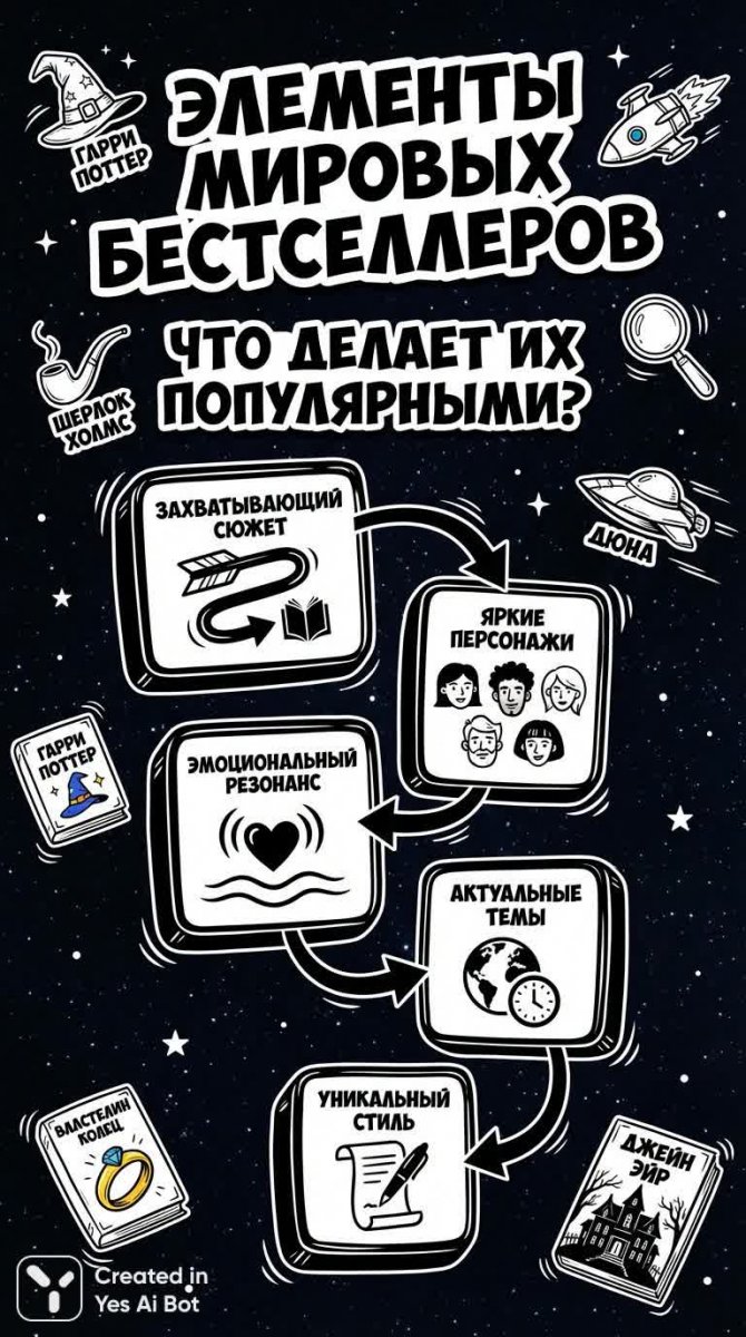 Мировые бестселлеры: динамичная инфографика об элементах успеха в книгах - Генерация изображения с помощью нейросети NanoBanana