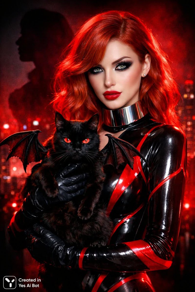 Ошеломляющий портрет, сотканный из смелости и тайны. В центре внимания – роковая красавица с огненно-красными волосами, воплощенная в дерзком черно-красном неоновом комбинезоне. Массивный металлический чокер подчеркивает ее сильный характер, а взгляд, обрамленный густыми черными ресницами и акцентированный яркими глазами, притягивает внимание, словно магнит. Алые губы завершают образ, излучая чувственность и уверенность в себе. В руках у нее – загадочная черная кошка с демоническими крыльями, ее верный спутник в этом мире теней и света. Мягкое красное сияние окутывает сцену, создавая атмосферу таинственности и романтики. На заднем плане простирается городской пейзаж, добавляющий глубину и масштаб происходящему. Стилизованный макияж в духе бурлеска придает портрету нотку ретро-шарма, а абстрактные тени в слиянии двойной экспозиции на черном фоне создают завораживающий визуальный эффект. Выражение лица модели передает целую гамму эмоций – от легкой грусти до скрытой страсти. Атмосферное освещение подчеркивает драматизм композиции, делая каждый элемент картины насыщенным и ярким. Это не просто фотография – это визуальная поэма о красоте, силе и загадочности, воплощенная в одном захватывающем образе. Идеальное сочетание света и тени, цвета и формы, создает ощущение погружения в мир фантазий и грез, где реальность переплетается с вымыслом