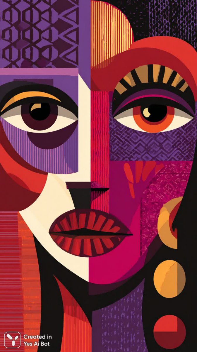 Завораживающий этнический портрет, где лицо разделено на две яркие половины, пульсирующие насыщенным пурпурным и алым цветами. Смелые геометрические узоры сплетаются в причудливый орнамент, окутывая взгляд и создавая ощущение древней мудрости, переосмысленной в современном ключе. Стиль выражен через акцент на детали: крупные, стилизованные глаза пристально смотрят вперед, а лаконичные аксессуары добавляют загадочности образу. Минималистичный дизайн подчеркивает графическую силу работы, где четкие контуры и плоский фон создают эффектную контрастность. Это современная интерпретация этнической эстетики, сочетающая в себе традиции и инновации, предлагающая зрителю погрузиться в мир ярких цветов, геометрических форм и символизма. Изображение излучает энергию и динамику, представляя собой уникальное произведение графического искусства, где каждый элемент тщательно выверен для достижения максимального визуального воздействия. Портрет словно рассказывает историю, полную тайн и загадок, приглашая к размышлениям о культуре, идентичности и красоте. Он является ярким примером того, как можно сочетать этнические мотивы с современными тенденциями в искусстве, создавая поистине впечатляющий и запоминающийся образ