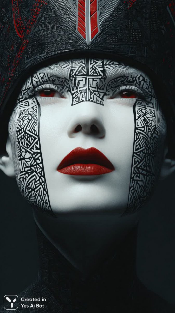Завораживающий портрет в стиле фэнтези представляет собой близкий взгляд на женщину с фарфоровой кожей и выразительным взглядом. Ее лицо украшено сложными геометрическими узорами, выполненными в сочетании черного и алого цветов, создавая ощущение загадочности и древней красоты. Яркие красные губы добавляют образу смелости и страстности, контрастируя с бледностью кожи. Взгляд ее глаз кажется сияющим и пронзительным, словно излучает внутреннюю энергию. На голове – изысканный головной убор из темных перьев, который придает облику мистический оттенок. Особое внимание привлекает сюрреалистическое освещение, создающее атмосферу нереальности и волшебства. Высокая детализация изображения позволяет рассмотреть мельчайшие нюансы текстуры кожи, узоров на лице и оперения головного убора. Этот портрет – это воплощение фантазийной красоты, где встречаются хрупкость фарфора, сила геометрических форм и таинственность потустороннего света. Он словно приглашает зрителя окунуться в мир грез и воображения, где реальность переплетается с вымыслом, а красота приобретает новые, неожиданные грани. Картина передает ощущение неземной элегантности и загадочной силы, заставляя задуматься о скрытых смыслах и символизме, заключенных в этом необыкновенном образе. Это произведение искусства – настоящая ода фантазии и мастерству художника, способного создать столь впечатляющий и запоминающийся портрет