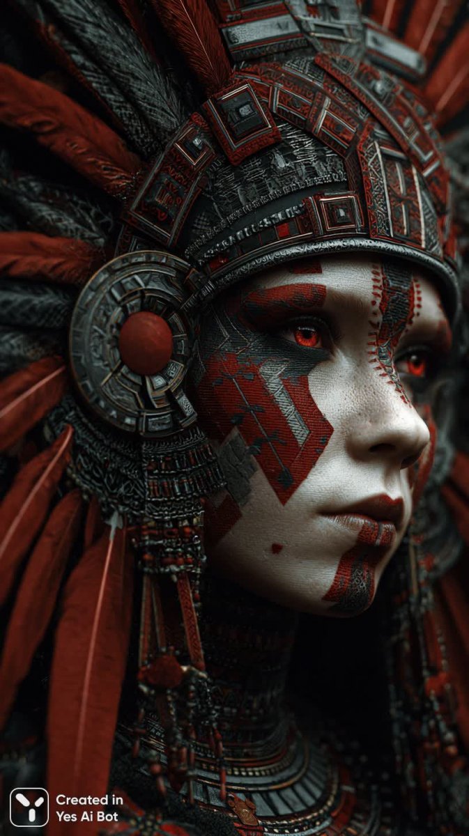 pale-skinned woman, intricate red and black geometric face patterns, glowing eyes, elaborate headdress with bold elements, close-up portrait, dramatic lighting, fantasy style, studio quality.