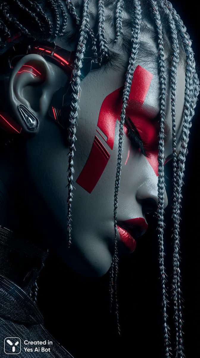 female cyborg with braided hair, neon elements on face, vivid red features, dramatic shadows, macro portrait, atmospheric lighting, surreal aesthetic, enhanced digital art quality.