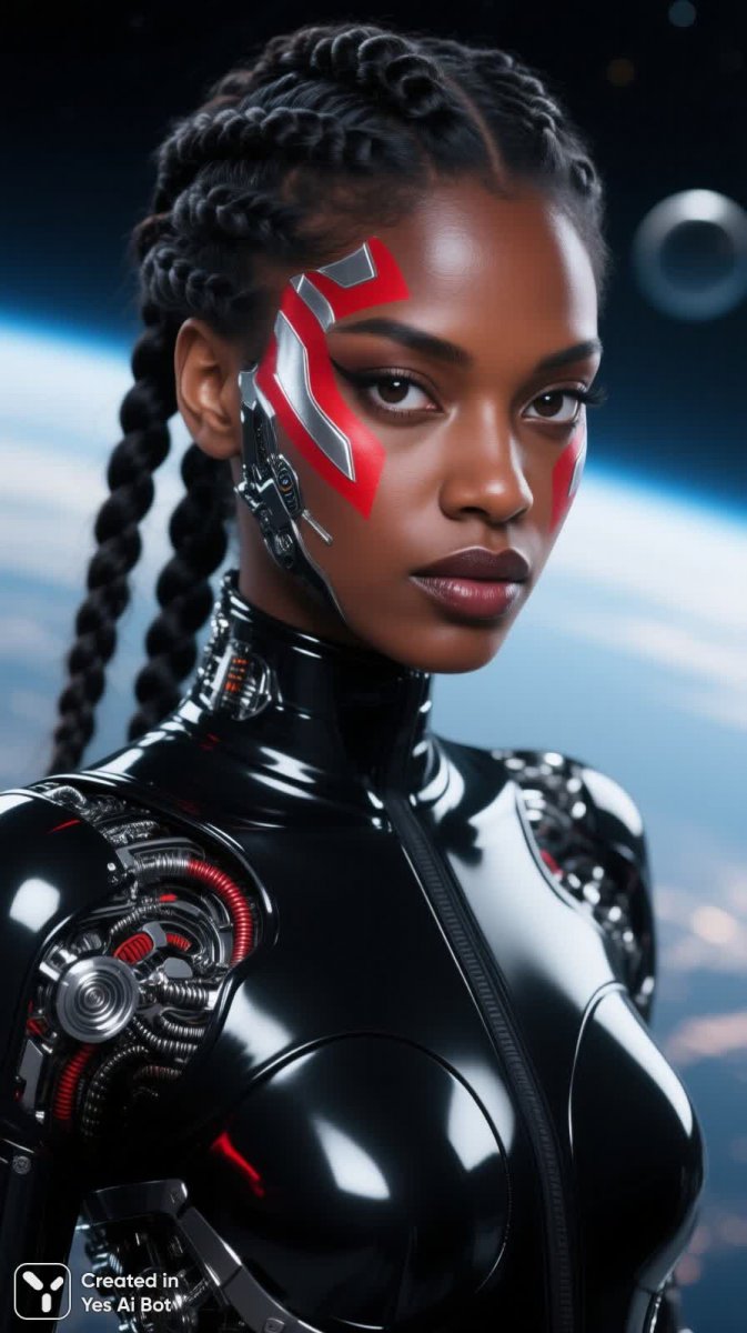dark-skinned woman with elaborate braided hair, vivid red and silver face patterns, sharp expressive eyes, black glossy bodysuit, blurred sci-fi BG, macro face shot, surrealism style, striking contrast, premium quality.