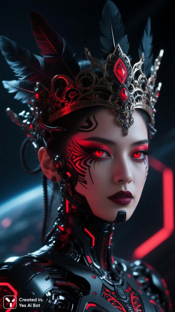 Загадочная женщина с поразительными светящимися алыми глазами, словно два пылающих уголька в непроглядной тьме. Ее лицо украшено причудливым переплетением черных и багряных узоров, создавая ощущение таинственности и потусторонней красоты. Яркий фантазийный макияж с насыщенными цветами подчеркивает ее необычность и добавляет образу неземной шарм. На голове возвышается роскошная корона, украшенная изящными перьями, символизирующая власть и величие. Фоном служит темное абстрактное пространство, которое лишь усиливает драматизм композиции и фокусирует внимание на лице героини. Крупный план портрета позволяет рассмотреть мельчайшие детали, передающие невероятную реалистичность изображения. Эффектная игра света и тени создает ощущение глубины и объема, придавая снимку особую выразительность. Вся картина пропитана духом киберпанка – сочетанием высоких технологий и мрачной антиутопии. Высокая детализация позволяет оценить мастерство художника, передавшего каждую черту лица, каждый оттенок цвета с филигранной точностью. Это образ сильной и независимой женщины, способной покорить любые вершины и противостоять любым вызовам. Она – воплощение фантазии, красоты и мощи, окутанная тайнами темного будущего. Этот портрет завораживает своей необычностью и оставляет неизгладимое впечатление в душе зрителя. Взгляд ее глаз словно проникает в самую душу, заставляя задуматься о загадках мироздания