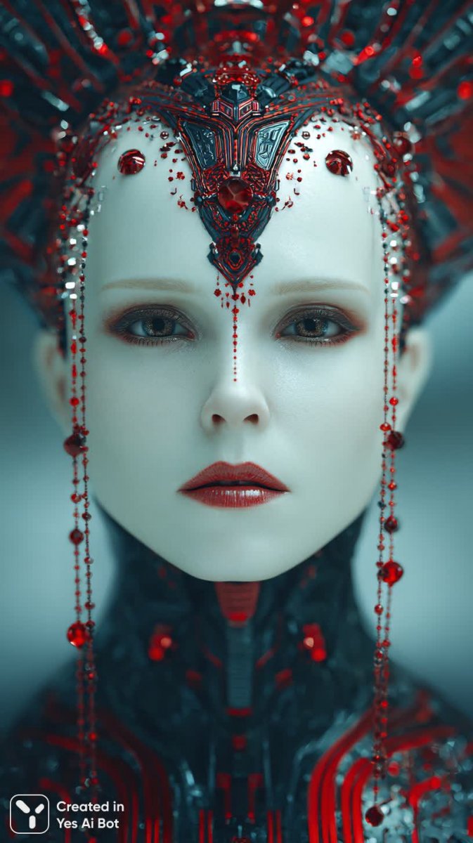 Портрет эффектной женщины с облысевшей головой и фарфоровым оттенком кожи завораживает своей мистической красотой. Ее лицо украшают яркие, симметричные узоры в черных и алых тонах, создающие ощущение древнего ритуала или магического заклинания. Губы выделяются насыщенным красным цветом, подчеркивая сильный характер модели. Роскошные головные наряды, инкрустированные драгоценными камнями, добавляют образу величия и загадочности. Съемка крупным планом позволяет рассмотреть мельчайшие детали: игру света на коже, сложную структуру узоров, блеск ювелирных украшений. Мрачная, фантазийная атмосфера создает ощущение погружения в альтернативный мир, полный тайн и опасностей. Яркое освещение акцентирует внимание на лице модели, усиливая эффект сюрреализма и подчеркивая ее необычную внешность. Качество изображения премиальное, что позволяет оценить всю глубину и сложность композиции. Этот портрет – не просто фотография, а настоящее произведение искусства, сочетающее в себе элементы фэнтези, моды и современного дизайна. Он вызывает ощущение благоговейного трепета перед непостижимой красотой и силой духа. Взгляд этой женщины пронзает зрителя, оставляя неизгладимое впечатление и заставляя задуматься о скрытых смыслах и тайнах человеческой природы. Композиция выполнена с безупречной точностью, каждый элемент продуман до мелочей, чтобы создать гармоничный и запоминающийся образ