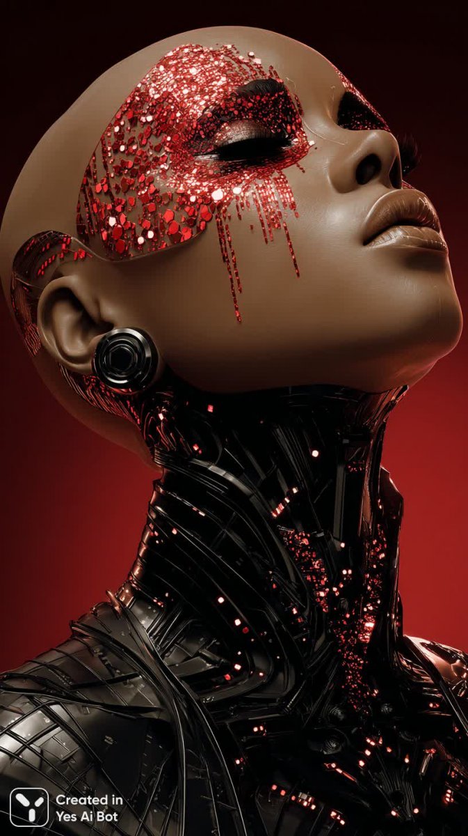Завораживающий портрет кибернетической женщины – воплощение футуристической элегантности и скрытой силы. Изображение демонстрирует уверенную в себе темнокожую женщину, чье лицо украшено яркими металлическими деталями насыщенного красного цвета, создающими эффектный контраст с общей мрачной атмосферой. Сложные ушные орнаменты добавляют образу не только эстетической привлекательности, но и намекают на передовые технологии, интегрированные в ее сущность. Она одета в облегающий черный костюм, подчеркивающий безупречную форму и графичность силуэта. Взгляд, направленный прямо в камеру, пронизывает зрителя своей интенсивностью и загадочностью. Тщательно проработанные драматические тени усиливают ощущение глубины и напряжения, создавая мистическую атмосферу научно-фантастического мира. Крупный план позволяет рассмотреть мельчайшие детали – от текстуры кожи до замысловатых узоров на кибернетических имплантах. Эта гипердетализированная иллюстрация представляет собой захватывающее сочетание человеческой красоты и технологических инноваций, погружая зрителя в мир далекого будущего, где грань между человеком и машиной стирается. Она словно вызов – взгляд из будущего, полный решимости и таинственности, заставляющий задуматься о месте человека в эпоху высоких технологий и неизведанных возможностях. В ней отражается не только сила духа, но и хрупкость существования в мире, где реальность переплетается с виртуальностью