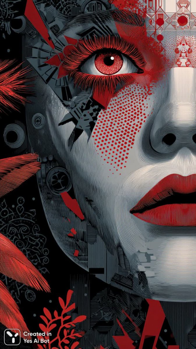 Завораживающий портрет женщины в стиле киберпанк, сотканный из смелых геометрических узоров насыщенных красного и черного цветов. Ее фарфоровая кожа контрастирует с ярким макияжем, подчеркнутым длинными алыми ресницами, а взгляд полон интенсивности и загадочности. Впечатляющий головной убор, украшенный перьями, придает образу драматизма и величия. Изображение выполнено в макро-формате, позволяющем рассмотреть мельчайшие детали лица и прочувствовать всю глубину эмоций. Художественный стиль сочетает элементы иллюстрации, графики и векторного искусства, создавая эффектный рисунок чернилами. Мрачная атмосфера темного фэнтези окутывает персонажа, усиливая ощущение потусторонности и таинственности. Каждый штрих, каждый оттенок проработаны с исключительной тщательностью, делая этот портрет настоящим произведением искусства. Впечатляющее сочетание стилей и техник создает уникальную визуальную историю, захватывающую внимание зрителя и оставляющую неизгладимое впечатление. Это не просто изображение – это окно в мир футуристической фантазии, где красота и опасность переплетаются воедино. Портрет излучает силу и уверенность, при этом сохраняя утонченность и элегантность. Идеально подходит для иллюстраций, обложек книг или создания атмосферных фонов