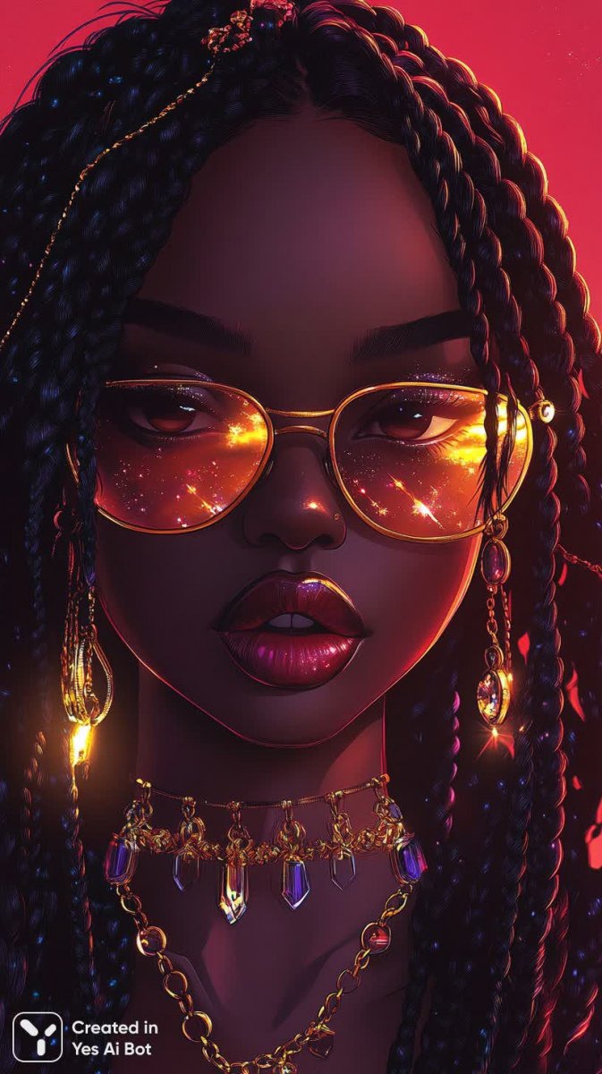 Роскошный студийный портрет демонстрирует уверенную в себе женщину с глубоким цветом кожи и длинными косами, украшенными изящными золотыми подвесками. Выразительный макияж подчеркивает ее красоту: драматичные золотые тени и яркая помада создают эффектный образ. Большие солнцезащитные очки отражают неоновые огни, добавляя портрету нотку загадочности и гламура. Аккуратные серебристые ногти с декоративными камнями завершают стильный ансамбль. Элегантные сверкающие украшения дополняют роскошный вид модели, создавая атмосферу изысканности и богатства. Яркий красочный фон добавляет динамики и контраста, а глянцевая отделка придает изображению особый шик и привлекательность. Это портрет, пропитанный атмосферой гламура и уверенности, воплощение современной женственности и стиля. Он передает ощущение силы, красоты и неповторимости, демонстрируя идеальный баланс между элегантностью и дерзостью. Каждая деталь продумана до мелочей, создавая поистине завораживающий образ, который не оставит равнодушным никого. Это визуальное воплощение роскоши, стиля и безупречного вкуса, приглашающее зрителя окунуться в мир гламура и красоты