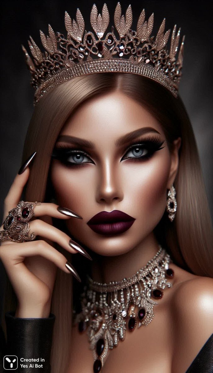 female model with long straight blonde hair, bold eyeliner, opulent jewelry, deep wine lipstick, long metallic nails, dramatic crown, studio lighting, glamorous style, dark blurred background, high definition.