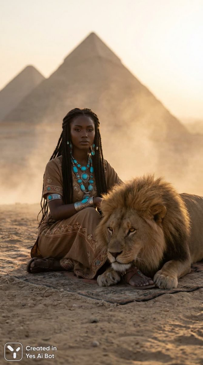 dark-skinned woman with long braided hair, wearing vibrant turquoise jewelry, large lion lying at her feet, enchanting golden light surrounding them, desert backdrop with pyramids, high-resolution fantasy portrait, detailed textures, artistic photography style.