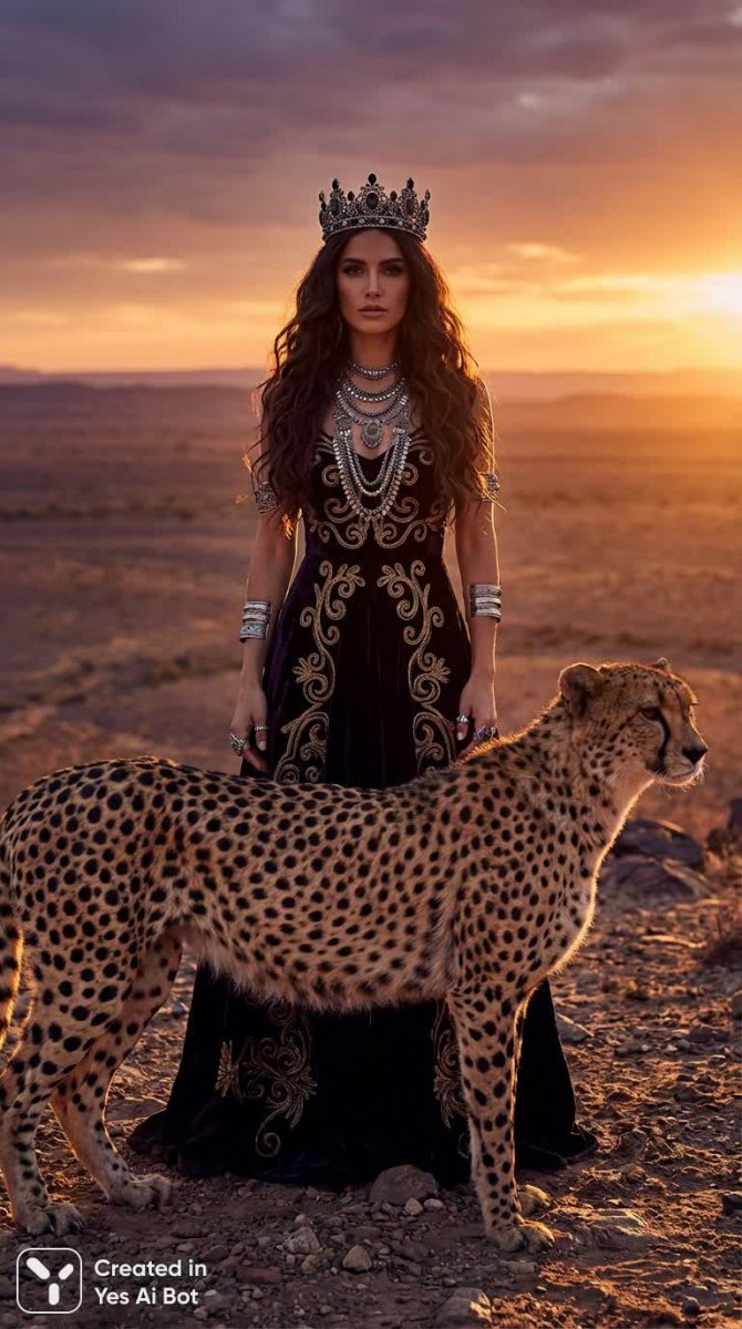 girl with long dark hair, adorned with silver jewelry and a striking crown, standing confidently next to a large cheetah, intricate gold patterns on dress, warm sunset BG, rich textures, high contrast, fashion editorial style.