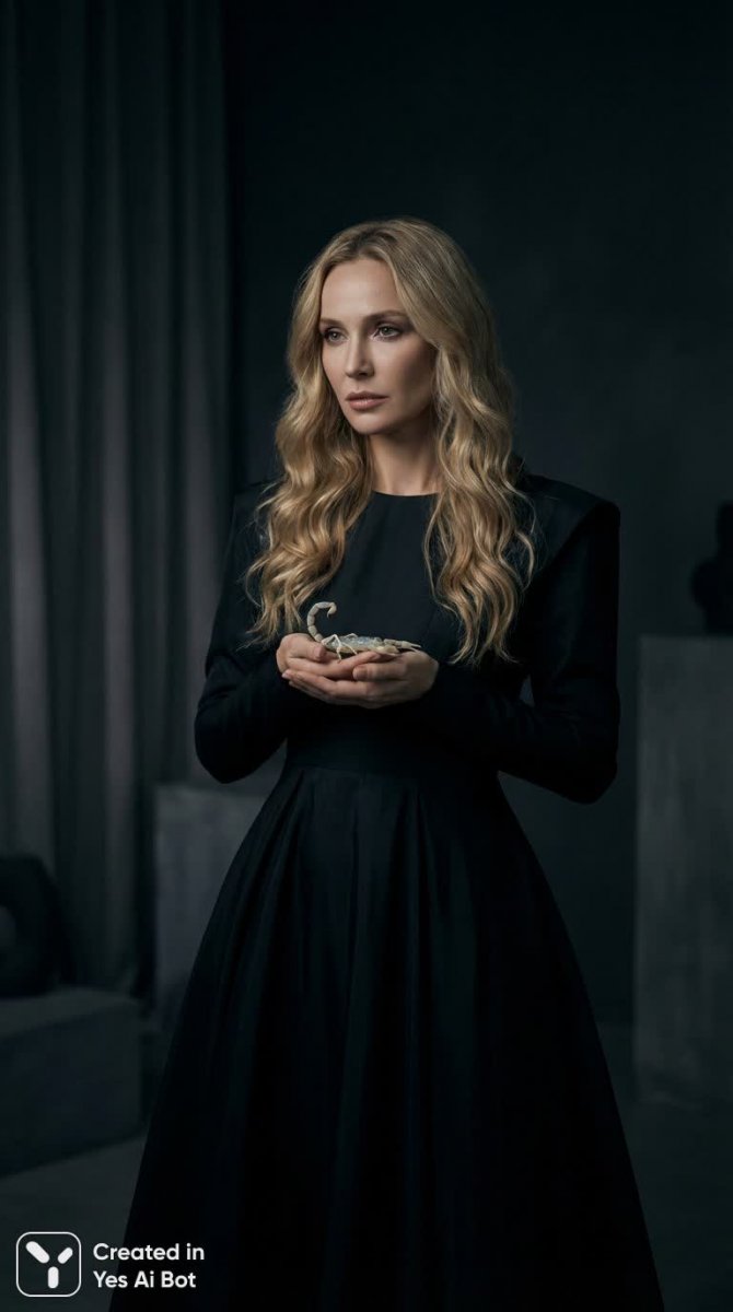 elegant woman with long blonde hair in flowing black gown, holding a delicate white scorpion, surrounded by dark shadows, minimalist elements, sharp focus on her expression, mysterious atmosphere, studio lighting, high detail composition.