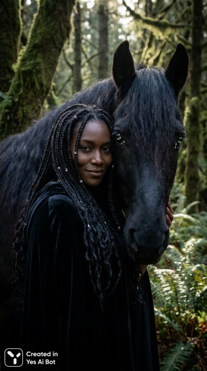 Загадочная чернокожая женщина с ниспадающими волосами, украшенными серебряными бусинами, смотрит вглубь себя, ее взгляд полон таинственности и скрытых смыслов. Впечатляющий образ дополняет величественный черный конь с мерцающими глазами, излучающий неземную красоту и силу. Действие разворачивается на фоне мистического леса, окутанного легкой дымкой, где каждый отблеск света подчеркивает сказочную атмосферу. Картина выполнена в стиле фэнтези с акцентом на драматическую композицию и близкий план, позволяющий рассмотреть мельчайшие детали лица женщины и лошади. Свет играет нежную роль, создавая ощущение легкости и эфирности, усиливающее общее впечатление от захватывающего дух произведения искусства. Это портрет, полный символизма и загадок, где переплетаются красота, сила и мистика, приглашая зрителя погрузиться в мир фантазий и воображения. Вся сцена пронизана ощущением волшебства и неразгаданной тайны, делая ее завораживающей и незабываемой. Наблюдатель словно становится свидетелем древней легенды, запечатленной в этом потрясающем изображении