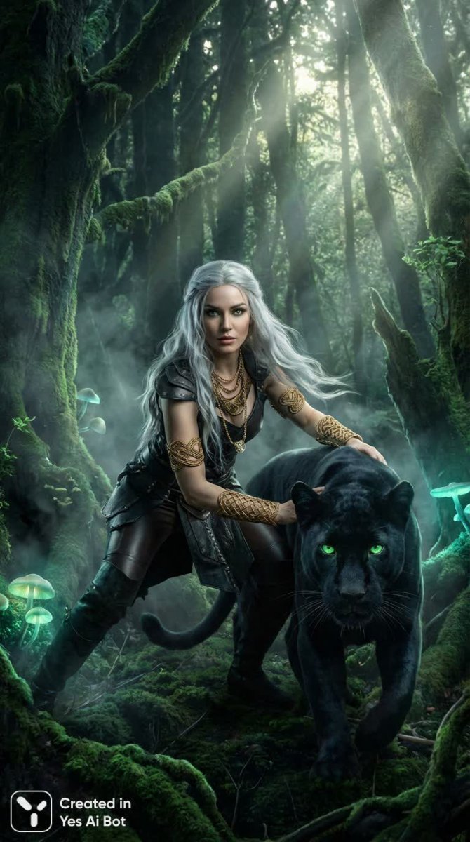 Завораживающая картина, сотканная из мистики и мощи. В центре внимания – величественная женщина с ниспадающими серебряными волосами, словно лунный свет в ночи. Её облик подчеркнут изящными золотыми украшениями, свидетельствующими о высоком статусе и глубокой связи с древними традициями. Она излучает уверенность и силу, застыв в решительной позе, гордо держа на руках огромного черного пантеру. Взгляд хищника пронзителен – изумрудные глаза светятся внутренним светом, отражая дикую природу и первобытную энергию. За ними простирается таинственный темный лес, окутанный густой дымкой загадочности. Атмосфера рисунка пронизана мистическим очарованием, погружая зрителя в мир фэнтези, где реальность переплетается с вымыслом. Всё это великолепие подчёркнуто драматичным освещением, которое подчеркивает каждую деталь и создает ощущение глубины пространства. Тщательно проработанные текстуры добавляют реалистичности и оживляют изображение, позволяя ощутить мягкость меха пантеры, гладкость золота украшений и шероховатость коры деревьев в темном лесу. Это не просто портрет – это история о силе духа, гармонии с природой и могуществе дикой красоты, воплощенная в одном захватывающем образе. Картина словно приглашает зрителя окунуться в мир сказок и легенд, где возможно всё