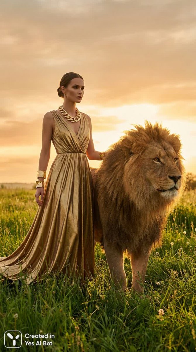 Изысканная женщина в облегающем золотом платье эффектно позирует рядом с величественным львом на залитой солнцем зеленой лужайке. Яркий и детализированный кадр демонстрирует роскошное украшение крупного плана, подчеркивающее элегантность образа. Оверсайз-аксессуары добавляют драматизма и создают запоминающийся контраст с природной мощью животного. Свет мягко касается гривы льва, придавая снимку объем и глубину. Фотография выполнена в стиле модной съемки с акцентом на яркие цвета и высокую детализацию каждого элемента композиции – от текстуры ткани платья до отдельных волосков на шкуре льва. Композиция передает ощущение уверенности и силы, сочетая в себе красоту женщины и дикую природу. Это визуальный гимн элегантности, смелости и гармонии с окружающим миром. Вся сцена пронизана атмосферой роскоши и эксклюзивности, представляя собой яркий пример современной модной фотографии, где встречаются изысканный стиль и мощь дикой природы. Кажется, что это момент абсолютной уверенности и покоя в окружении первозданной красоты