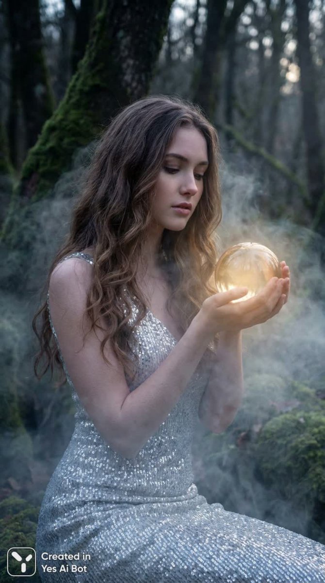 Волшебная сцена из мира грез – девушка с длинными струящимися каштановыми волосами в мерцающем серебристом платье из пайеток застыла в призрачном лесу. В её руках хрустальный шар наполненный мягким сиянием, словно заключенное внутри звездное небо. Эфирный туман окутывает ее фигуру создавая ощущение нереальности и таинственности. Мягкий зачарованный свет подчеркивает детализированные текстуры платья волос и хрупкого шара, усиливая сказочную атмосферу. Фотография выполнена в стиле модной съемки с акцентом на крупные планы позволяющие рассмотреть каждую мелочь. Эта работа – воплощение красоты грации и волшебства, словно сошедшее со страниц фэнтезийной книги или из самого сердца мечты. Идеальный баланс между реальностью и фантазией создает неповторимую ауру загадочности и очарования. Вся сцена пронизана атмосферой сказки и нежности, приглашая зрителя окунуться в мир грез и таинственных открытий. Это визуальное произведение искусства – ода женственности красоте и силе воображения