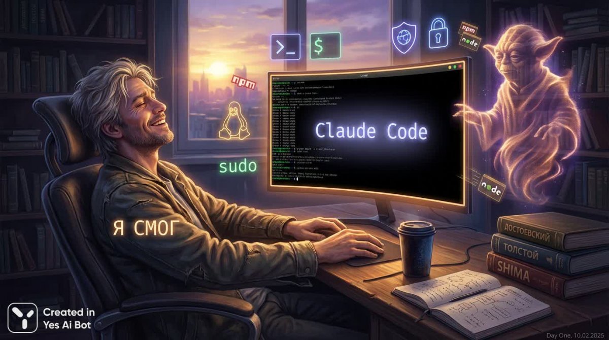 В полумраке комнаты, освещенной лишь сиянием экрана, застыл момент чистого интеллектуального триумфа. Блондин с сединой и легкой щетиной, словно герой из мира гуманитарных наук, откинулся на спинку кресла, его лицо выражает смесь удивления и гордости. На мониторе – строки кода Linux, приветствие Claude Code, а рядом парит полупрозрачный силуэт AI-ассистента, светящаяся сущность мудрости и знаний, напоминающая северное сияние. Вокруг царит атмосфера цифровой магии: неоновый пингвин Tux, символы командной строки, летящие пакеты данных – все это сплетается в завораживающий танец света и информации. На столе – остывший кофе, стопка книг классической литературы, раскрытый блокнот с набросками серверной архитектуры. Теплый контровой свет создает ореол вокруг фигуры, а за окном едва заметен рассвет, предвещающий начало нового пути. 'Day One. // 10.02.2026' – скромная надпись в углу экрана. Это не просто изображение – это визуальная ода интеллекту, творчеству и моменту осознания: 'Я СМОГ'. Эпическая сцена, наполненная теплом и вдохновением, запечатлевает триумф человеческого разума в эпоху цифровых технологий, где границы между реальностью и виртуальностью стираются, а возможности кажутся безграничными. Картина словно шепчет о новых открытиях, инновациях и неиссякаемом потенциале человека, объединенного с мощью искусственного интеллекта