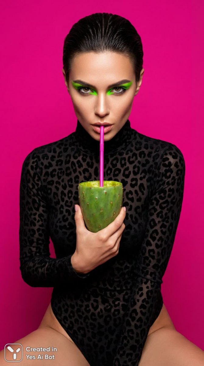 Завораживающий портрет современной бунтарки, запечатленный в стиле модной фотографии высокой моды. В центре внимания – женщина с дерзким макияжем неоново-зеленого цвета, взгляд которого приковывает внимание своей интенсивностью и загадочностью. Ее гладкие темные волосы, тщательно уложенные назад, подчеркивают решительность образа. Она наслаждается напитком через розовую трубочку из половинки кактуса – неожиданный и запоминающийся элемент, добавляющий пикантности снимку. Обтягивающий черный боди с леопардовым принтом идеально облегает фигуру, создавая эффектную игру света и тени. Яркий розовый фон служит контрастным дополнением к насыщенным цветам и подчеркивает современность композиции. Макро-съемка позволяет рассмотреть мельчайшие детали – текстуру кожи, блеск макияжа, узор боди, добавляя изображению глубину и реалистичность. Этот снимок - воплощение смелости, уверенности в себе и готовности ломать стереотипы, настоящий манифест моды будущего, где встречаются природа и технологии, дерзость и элегантность. Он передает атмосферу креативности и бунтарства, вдохновляя на эксперименты с внешностью и самовыражение. Камера запечатлела момент абсолютной уверенности и независимости этой яркой индивидуальности