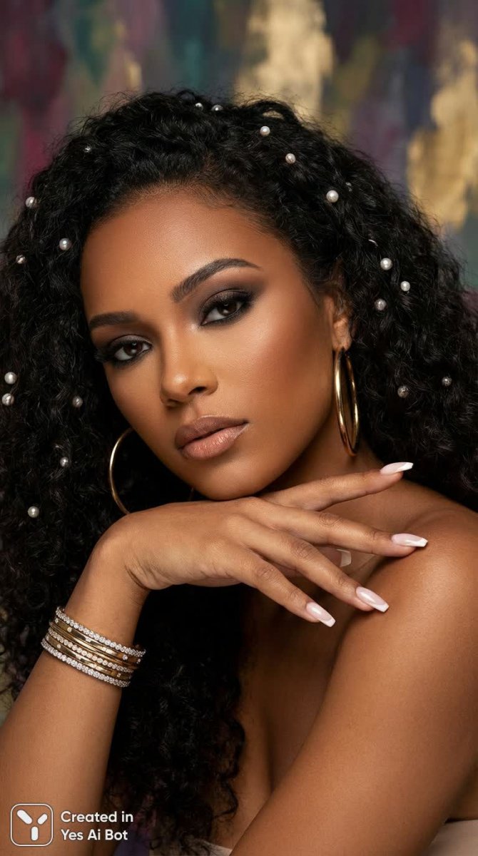 luxurious woman with dramatic makeup, voluminous curls adorned with pearls, gold hoop earrings, sparkling bracelets, rich tan skin, long French manicure nails, studio lighting, opulent style, fashion portrait, abstract colored BG.
