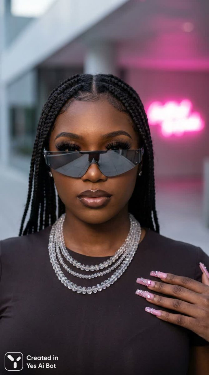 dark-skinned woman with braided hair, pink long nails with decorations, futuristic sunglasses, layered crystal necklaces, bold lashes, shiny lips, neon pink glow in BG, close-up, glamor style, high-definition photography, soft lighting.