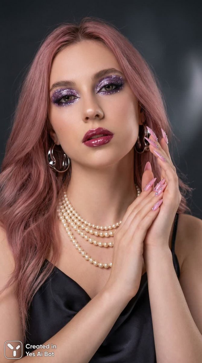 Яркий и запоминающийся портрет молодой женщины, воплощающей в себе смелость и креативность. Её длинные розовые волосы создают эффектный контраст с безупречным тоном кожи, а драматичный макияж глаз, украшенный мерцающими блестками, притягивает взгляд и подчеркивает выразительность взгляда. На губах – глянцевая помада насыщенного оттенка, добавляющая образу чувственности и уверенности. Элегантность проявляется в многослойных жемчужных колье и массивных серьгах, гармонично дополняющих общий стиль. Акцент на деталях – длинные розовые ногти, украшенные сверкающими камнями, завершают образ, демонстрируя внимание к каждой мелочи. Мягкий размытый фон создает атмосферу утонченности и позволяет полностью сосредоточиться на модели. Профессиональное освещение в студии подчеркивает текстуру волос, кожи и ткани, создавая объемный и реалистичный эффект. Это портрет, который излучает энергию, стиль и индивидуальность, вдохновляя на смелые эксперименты с образом и самовыражение. Впечатление от фотографии – это сочетание нежности и дерзости, классической элегантности и современной моды. Она словно сошла со страниц глянцевого журнала, являясь воплощением современного женского идеала