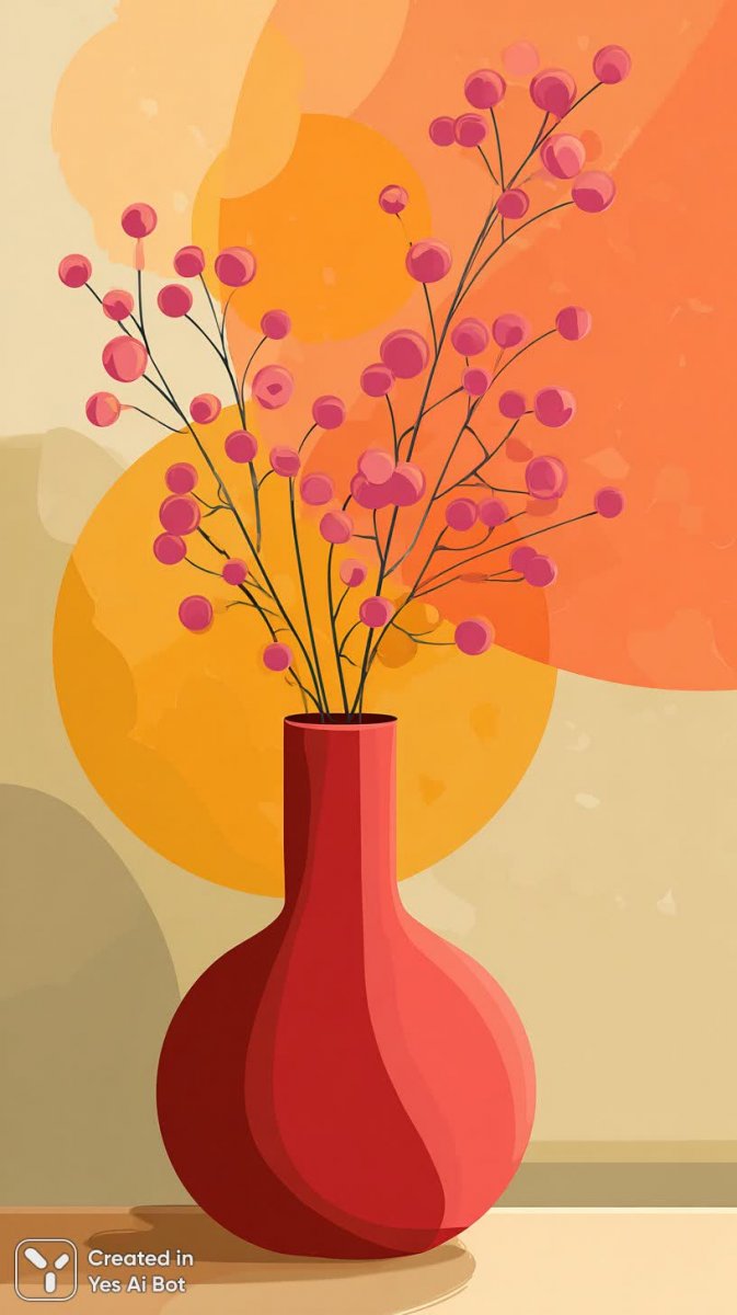 Яркая абстрактная картина представляет собой красную круглую вазу, украшенную нежными розовыми цветами. Фон выполнен в виде плавного градиента от оранжевого к желтому, создавая ощущение тепла и света. Стиль картины сочетает минимализм и геометрические формы, что придает ей современный и лаконичный вид. Это векторное искусство отличается мягкими изгибами и чистыми линиями, подчеркивающими элегантность композиции. Изображение излучает позитивную энергию и оптимизм благодаря насыщенным цветам и гармоничному сочетанию форм. Ваза с цветами выглядит как символ красоты и утонченности, а абстрактный фон добавляет картине глубины и загадочности. Картина идеально подойдет для оформления интерьера в современном стиле, добавив нотку изысканности и индивидуальности. Она способна стать акцентом в любой комнате и подарить ощущение спокойствия и гармонии. Это произведение искусства представляет собой прекрасный пример того, как сочетание простых форм и ярких цветов может создать неповторимую атмосферу. В работе чувствуется влияние современных тенденций в дизайне, что делает ее актуальной и востребованной. Картина выполнена с большой любовью к деталям и вниманием к композиции, что позволяет зрителю наслаждаться каждой линией и цветом. Она вдохновляет на творчество и дарит ощущение радости
