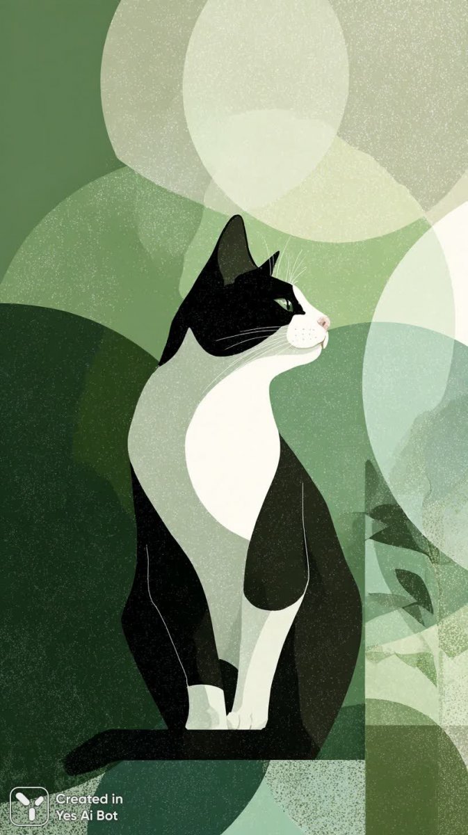 Изящное минималистичное произведение искусства представляет собой черно-белого кота на нежном пастельно-зеленом фоне, создавая ощущение спокойствия и умиротворения. Вокруг животного аккуратно расположены геометрические фигуры, добавляющие композиции структурированности и современного шарма. Уши кота настороженно подняты, что придает ему выражение бдительности и любопытства, словно он внимательно наблюдает за окружающим миром. Мягкие изгибы линий вносят нотку игривости и легкости, делая изображение более привлекательным и запоминающимся. Вся композиция выполнена в стиле векторной графики, что обеспечивает четкость линий и лаконичность форм, подчеркивая минималистичную эстетику произведения. Это работа идеально подойдет для любителей современных тенденций в искусстве и дизайна, а также для тех, кто ценит простоту и элегантность в сочетании с очарованием кошачьего образа. Картина излучает атмосферу уюта и спокойствия, станет прекрасным украшением интерьера и подарит позитивные эмоции каждому зрителю. Сочетание черно-белых тонов с мягким пастельным фоном создает визуальную гармонию и притягивает взгляд, оставляя ощущение чистоты и свежести. Это больше чем просто изображение кота это воплощение минимализма в искусстве