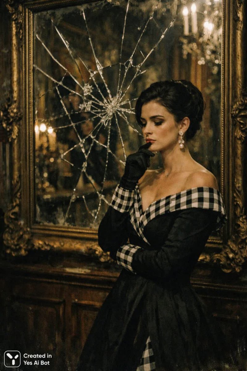 woman dressed in elegant black gown with white checkered accents, high neckline, looking pensive with one hand on her chin, standing before an ornate mirror reflecting broken glass, BG is richly decorated room, camera is fuji xt4, 35mm lens, classic portrait film style, muted tones, slow shutter speed.