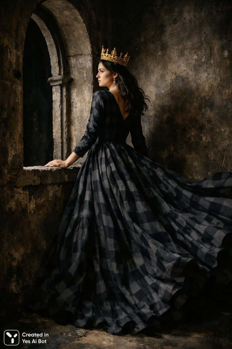 Загадочная фигура женщины в длинном струящемся черном платье с клетчатым узором приковывает взгляд своей неземной красотой и печальной задумчивостью. На ее голове возвышается золотая корона, подчеркивающая аристократичность и властность, но взгляд направлен вдаль, словно она видит что-то за пределами нашего мира или размышляет о чем-то глубоком и сокровенном. Рядом с ней зияет огромная трещина в стене – символ разрушения, перемен или скрытой правды, которая вот-вот вырвется наружу. Драматичные тени, играющие на лице и одежде, добавляют сцене атмосферу таинственности и напряжения, усиливая эмоциональное воздействие. Фон выполнен в темных текстурированных тонах, создающих ощущение глубины и замкнутости, словно женщина находится в уединенном месте, отрезанном от остального мира. Фотография, сделанная на Leica M10 с объективом 50mm при диафрагме f/2 в условиях низкой освещенности, отличается исключительной четкостью и детализацией, позволяя рассмотреть каждую мелочь – от текстуры ткани платья до бликов золота на короне. Общий настрой снимка драматичный и заставляющий задуматься, приглашая зрителя к размышлению о судьбе, времени и хрупкости всего сущего. Это портрет женщины, стоящей на перепутье, перед лицом неизбежных перемен, с гордо поднятой головой и печалью в глазах. Кажется, она знает нечто важное и готова принять свою судьбу, какой бы она ни была