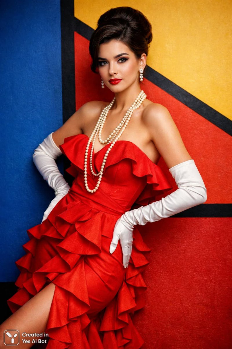 woman in vibrant red dress with cascading ruffles, positioned against a geometric patterned wall, long gloves and vintage pearls accent her look, hair styled in a classic updo, BG is bold color blocking, mood is striking and modern, taken with sony a7iii, 35mm lens, f/2.8, film style is fashion, vibrant saturation, shutter speed 1/250 sec.