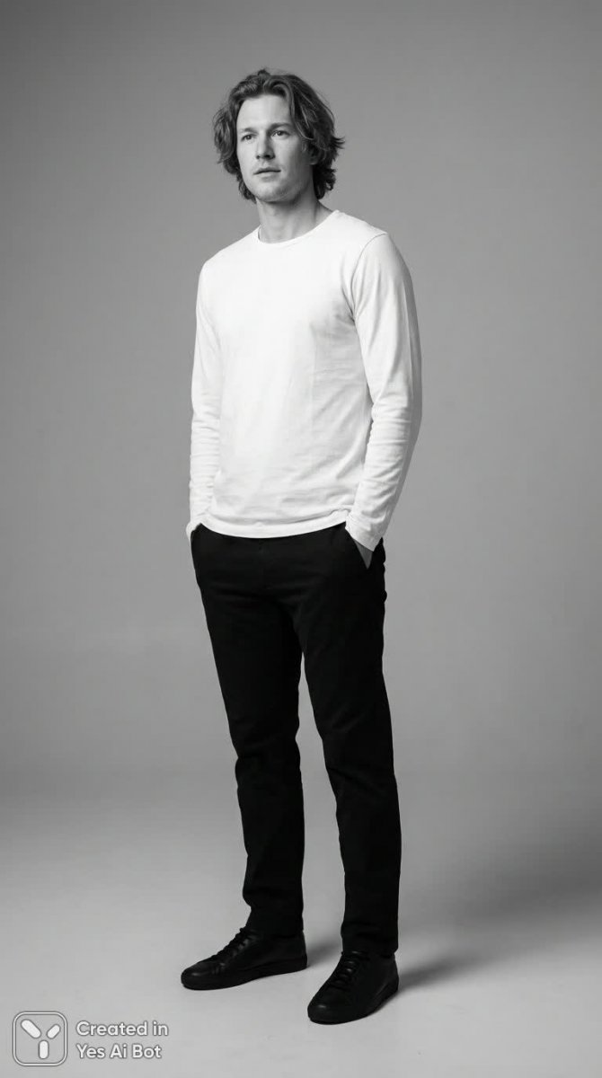 Изысканный портрет уверенного в себе мужчины, запечатленный профессиональным фотографом с использованием высококачественного оборудования Nikon Z7 и объектива 85mm f/1.4. Съемка выполнена под низким углом в студийных условиях, что придает образу динамичность и подчеркивает атлетическую фигуру модели. Мужчина облачен в стильный монохромный комплект: длиннорукавая футболка с круглым вырезом белого цвета и классические черные чиносы прямого кроя. Завершает образ пара минималистичных черных кед, создающих непринужденную атмосферу. Его поза расслабленная и естественная, а слегка растрепанные волосы средней длины добавляют нотку небрежной элегантности. Фон намеренно выдержан в приглушенных тонах, чтобы акцентировать внимание на модели и избежать отвлекающих деталей. Фотография отличается исключительной четкостью и резкими деталями, благодаря чему каждая текстура и линия идеально переданы. Композиция минималистична и лаконична, что подчеркивает эстетику фотографии в стиле фотореализма. Использование профессионального оборудования и мастерство фотографа позволили создать образ, сочетающий в себе элегантность, уверенность и естественную красоту. Это портрет, который говорит сам за себя, излучая спокойствие и стиль