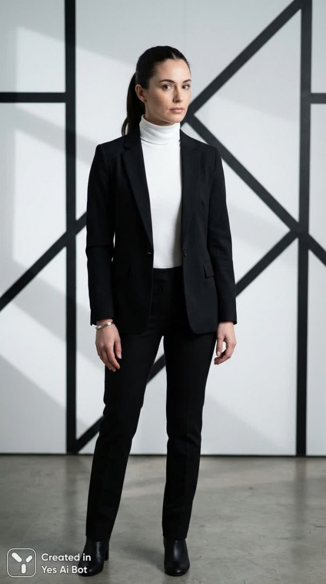 professional photo, canon eos r5, 50mm f/1.2 lens, front view, full body, woman in structured black blazer over fitted white turtleneck, sleek black trousers, minimal silver cuff bracelet, standing against geometric black and white graphic background, straight hair pulled back, soft shadows, photorealistic, high detail, minimalist aesthetic.